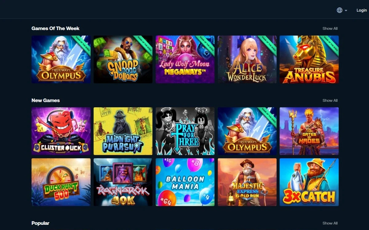 A plataforma oferece uma ampla variedade de caça-níqueis e jogos de mesa clássicos, como blackjack, roleta, bacará e pôquer. Também oferece mesas com crupiê ao vivo e apostas esportivas em futebol, basquete e esportes eletrônicos.