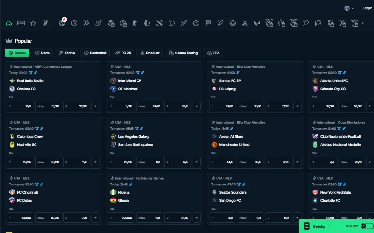 Há também uma seleção de corridas de cavalos e galgos realizadas nos EUA e em outros países, oferecendo uma ampla gama de opções de apostas.